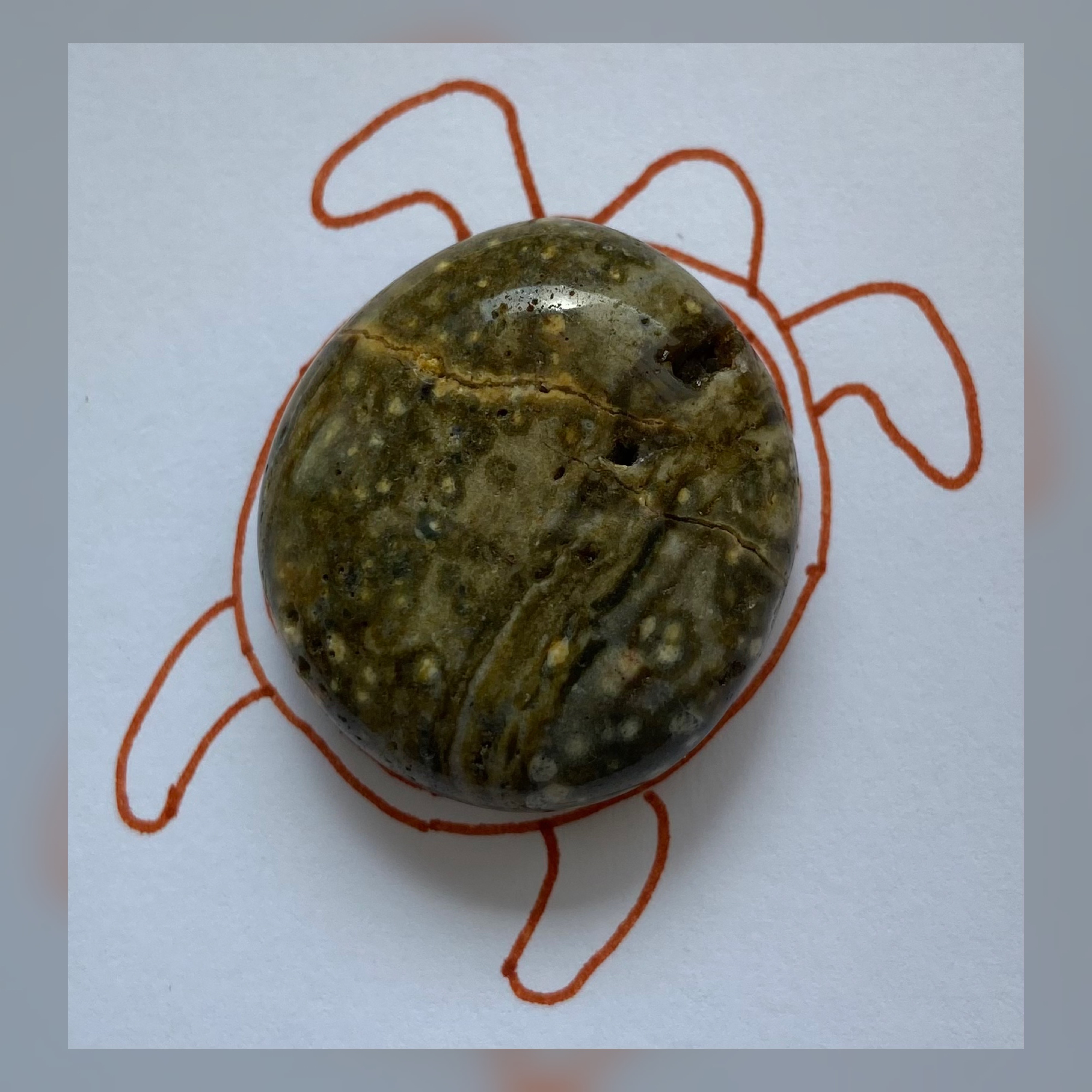 Beim Aussuchen welche Ozeanjaspis-Steine mit mir nach Hofstetten ins Atelier kommen, ist mir ein kleiner, fast runder, grünlich-beiger Stein aufgefallen. Er hat mich sofort an den Panzer einer Schildkröte erinnert.